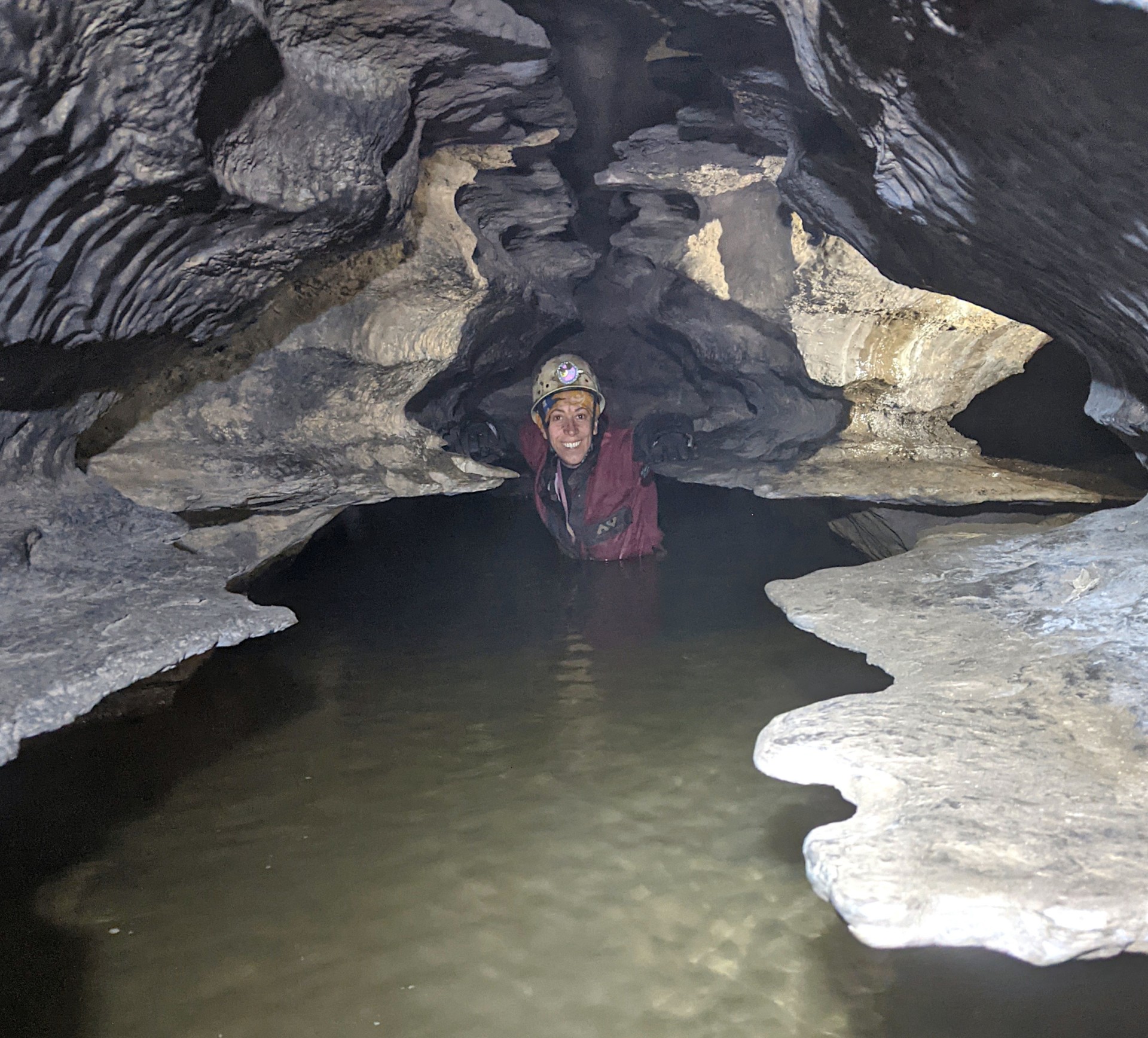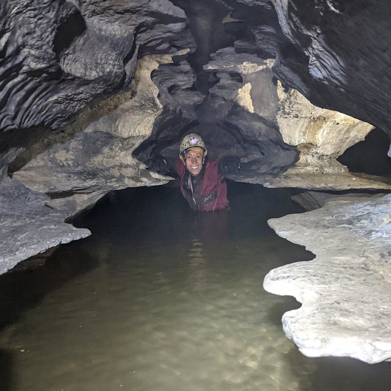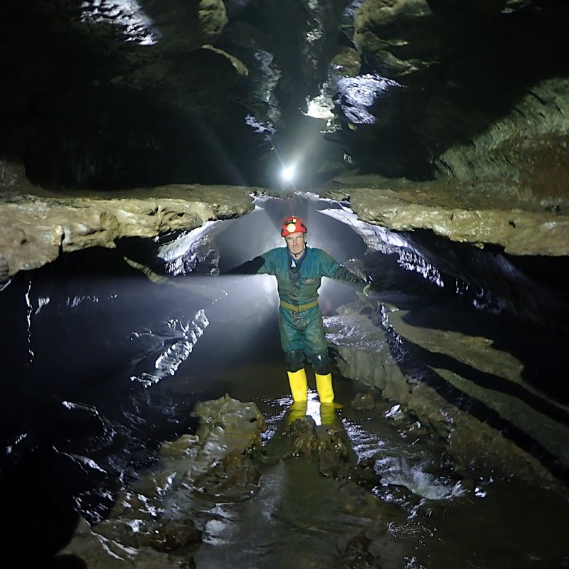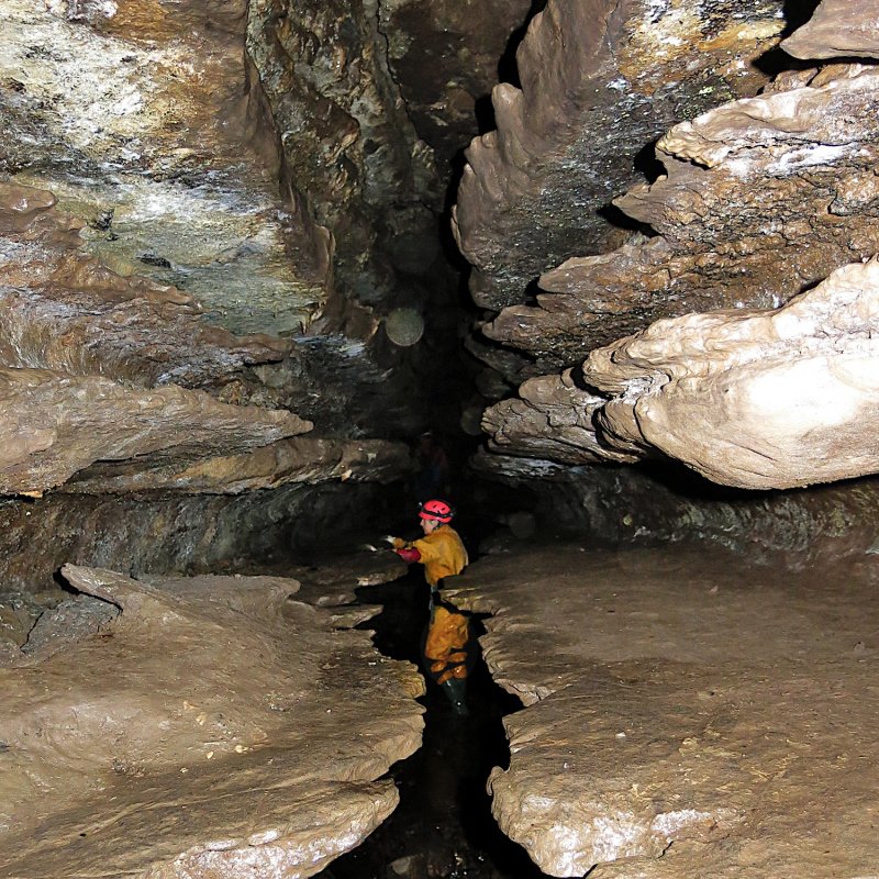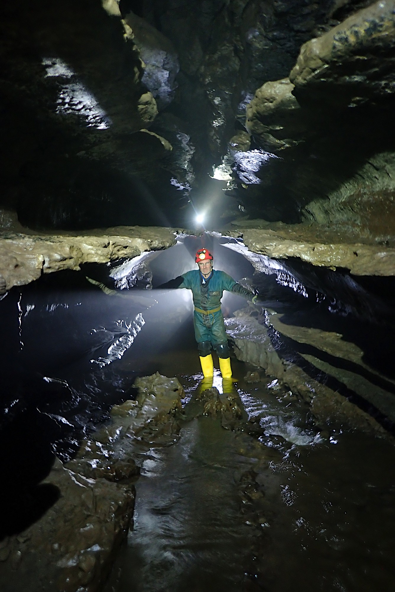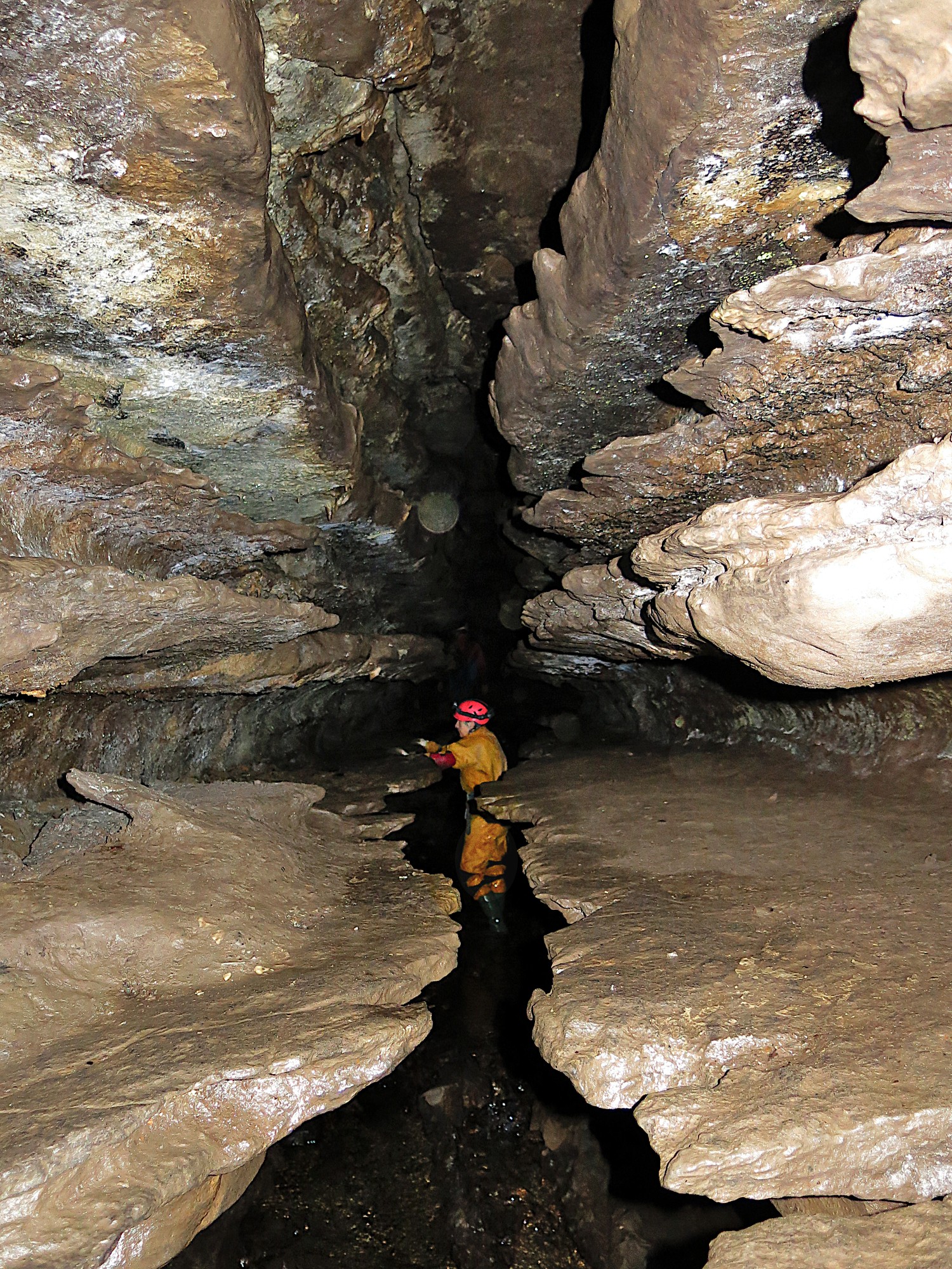 From the drop down, the round trip starts as a low crawl at the bottom of the rift before turning to the left. More crawling, some of which through puddles, soon leads to the window passed earlier where a short climb down regains the streamway.