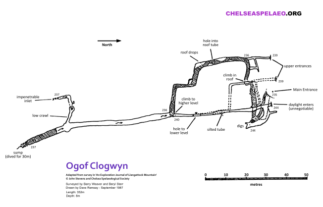 Ogof Clogwyn is easily recognisable by the waterfall issuing from its entrance. A short easy climb up gains the stream passage, which soon becomes walking height with exceptional phreatic shelving providing the option to traverse above the water. The first features passed are a short oxbow and tube to a high-level window in cliffs on ledges to the right, while a hole in the wall opposite is where the round trip rejoins the streamway. The next oxbow and tube on the right lead to the smaller and more awkward alternative entrance, which can be used on the way out for variety. A boulder pile on the left at a distinct bend in the passage 60m further marks the 4m climb up to the Upper Series and the round trip, but it makes sense to visit the end of the cave first and do this on the way back. The stream passage continues as easy walking before lowering to meet a sump after approximately 70m. A side passage on the right just before the end soon meets a second smaller sump.