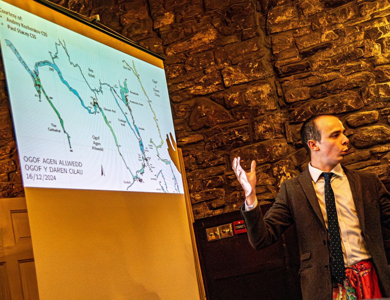 After caving it was time to head off to The Bear in Crickhowell for the club’s Annual Dinner, where a very social evening was enjoyed by all. The after dinner entertainment was a short presentation on the progress of the Priory Road ‘Merry Monks’ digging team, with surveys and photos of the new round trips and discoveries found. The well-attended Annual General Meeting took place on Sunday in Crickhowell Parish Hall, after which there was just time for some to squeeze in an additional caving trip to Eglwys Faen.