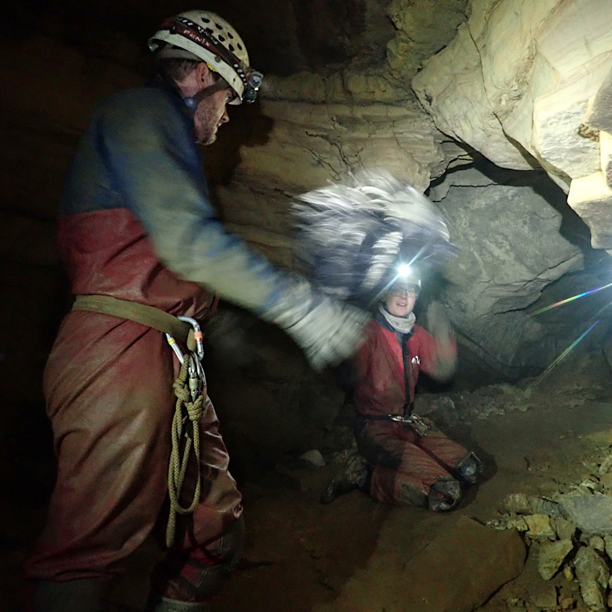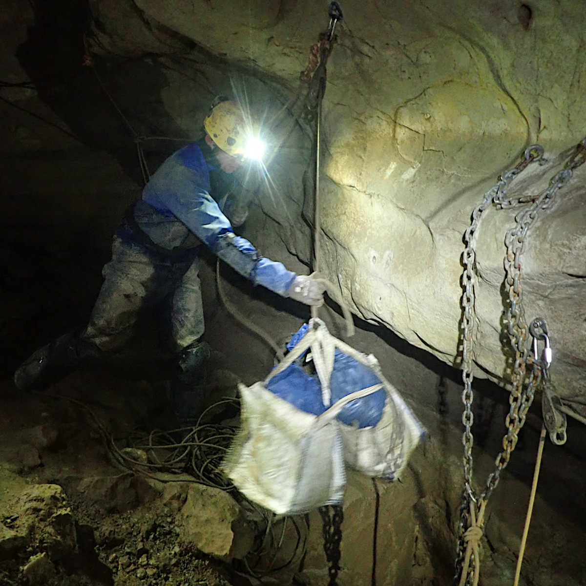 The mission was to relocate the large pile of 40+ bags and drums from its current position in White Passage to Big Chamber Nowhere Near the Entrance, where items could then be collected and taken out by anyone passing by on a through trip or similar. This was successfully accomplished due to the fantastic teamwork by all involved. Bags were passed by means of a chain-gang from person to person for much of the distance, while dumpy bags were used on the rope climbs and ladder to minimise the risk of dropping items on those below. Participants entered and exited the cave by whichever entrance they preferred and each took a tackle bag of rubbish out with them, so a large amount of the pile is now completely out of the cave. Then it was back to Whitewalls for a well-deserved communal feast of chilli, pasta and cake. Thank you to everyone who took part and helped make it a really fun day as well as a productive one!