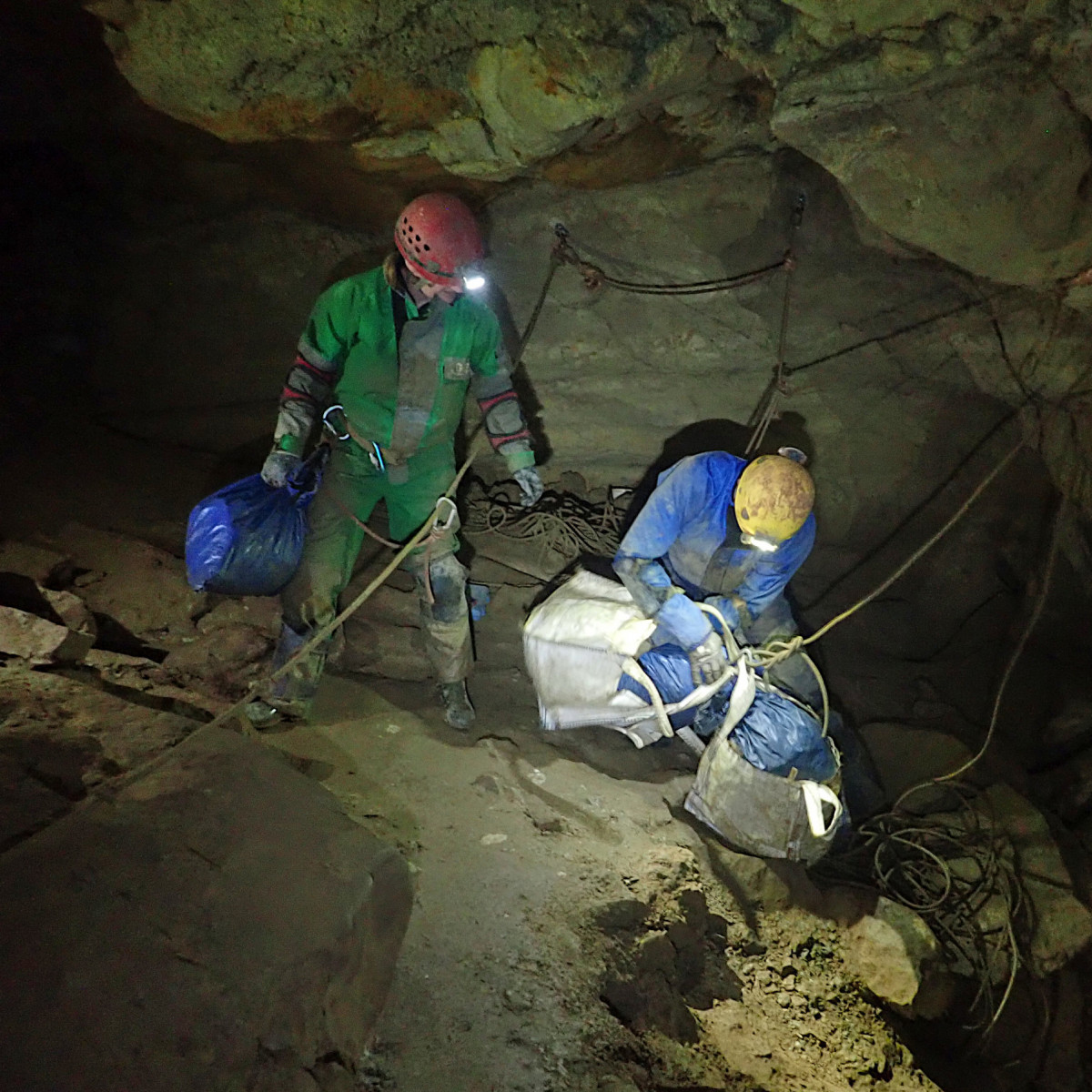 A mountain of rubbish bags lay in White Passage following the complete clear out of the long disused Western Flyover camp and a thorough clean-up at the Hard Rock Café camp – all that was needed now was to get them out of the cave.