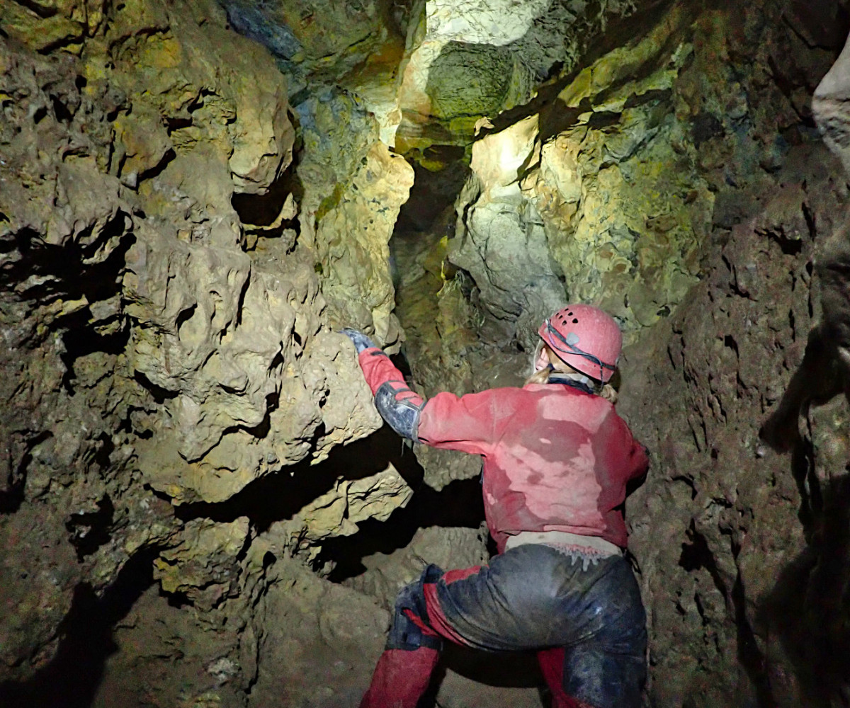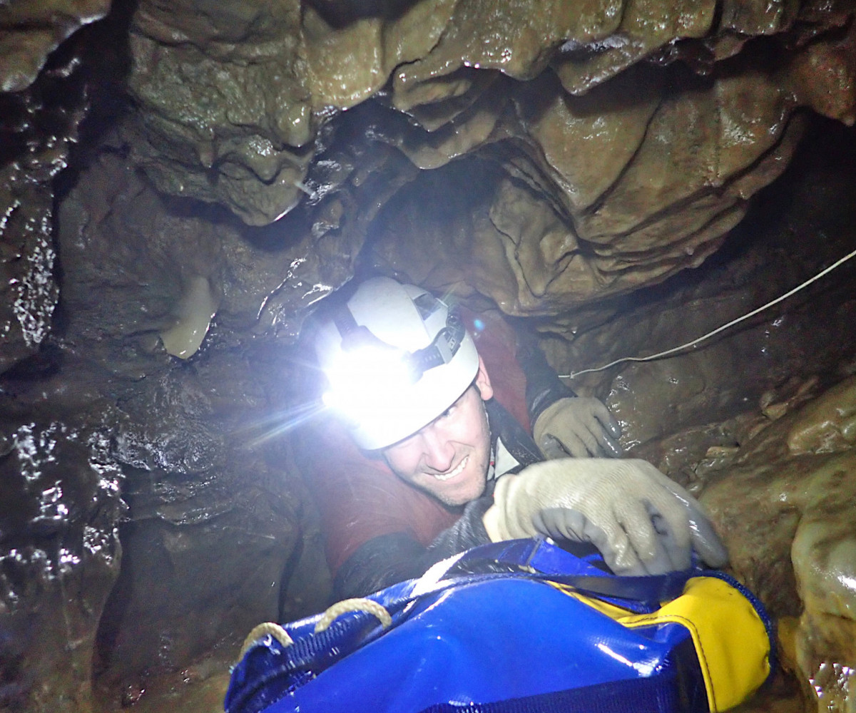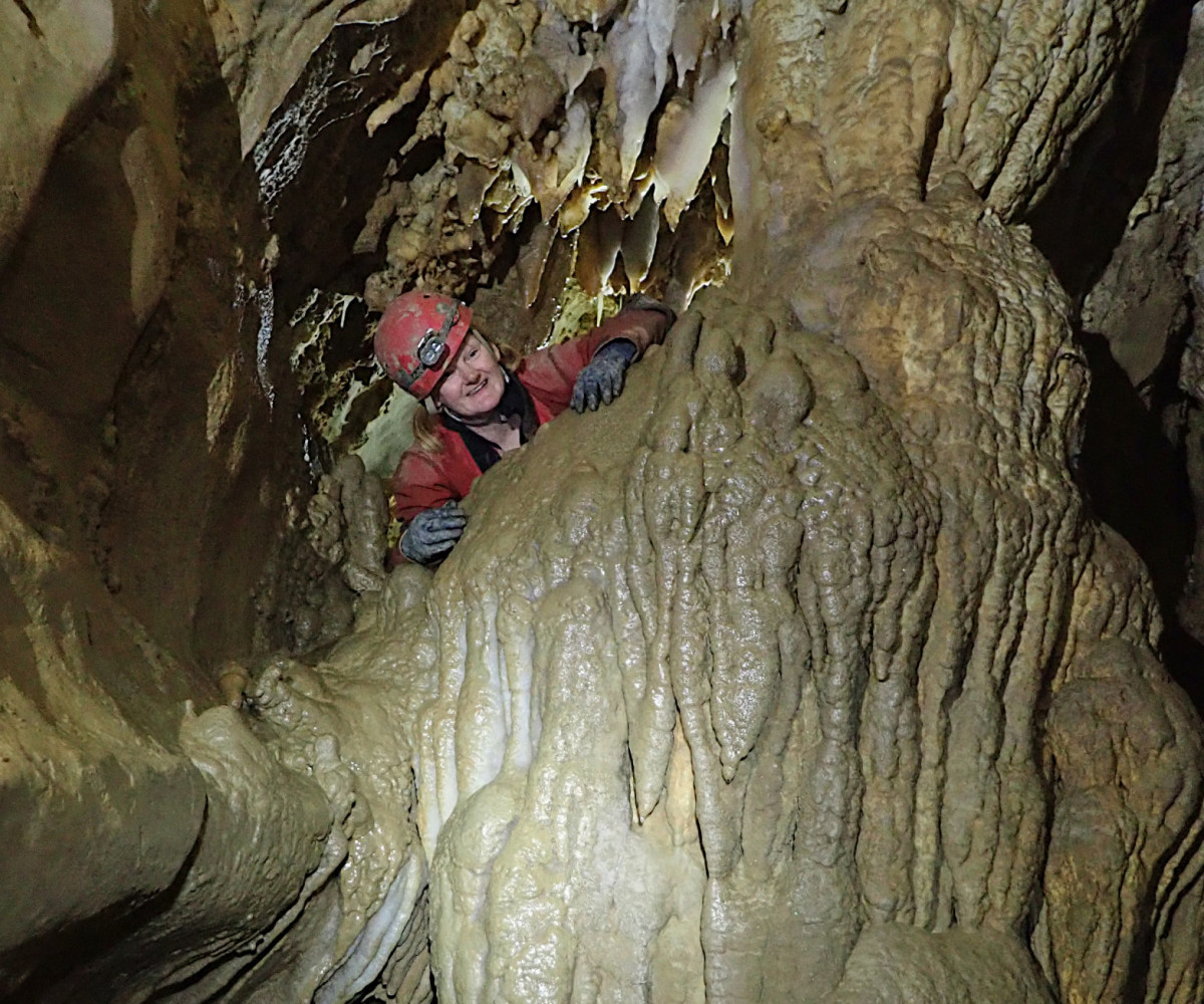 Calcite squeeze in Antler Passage traverse, Daren Cilau