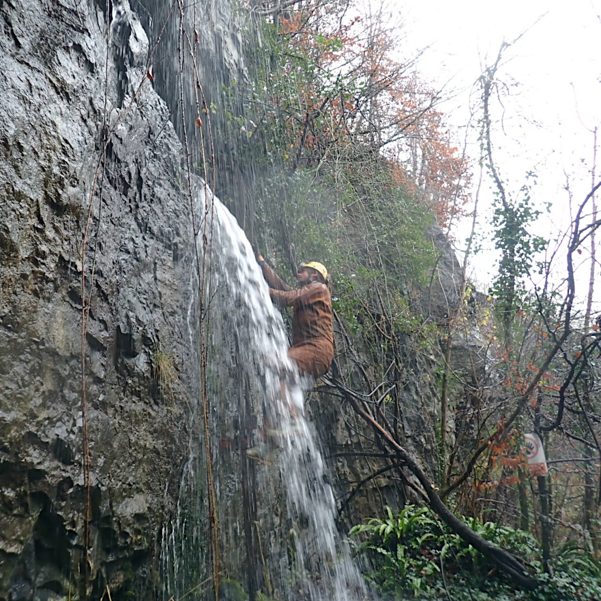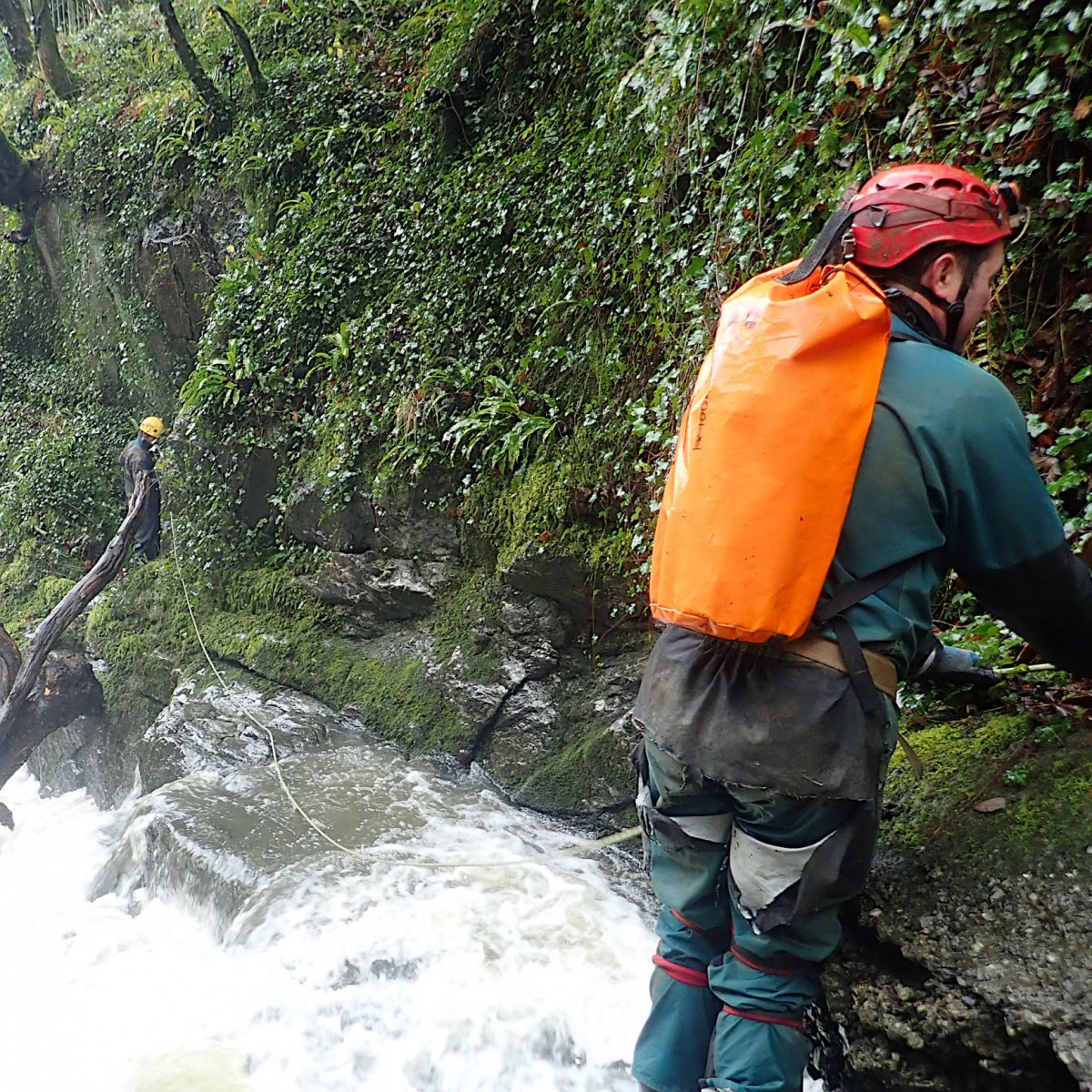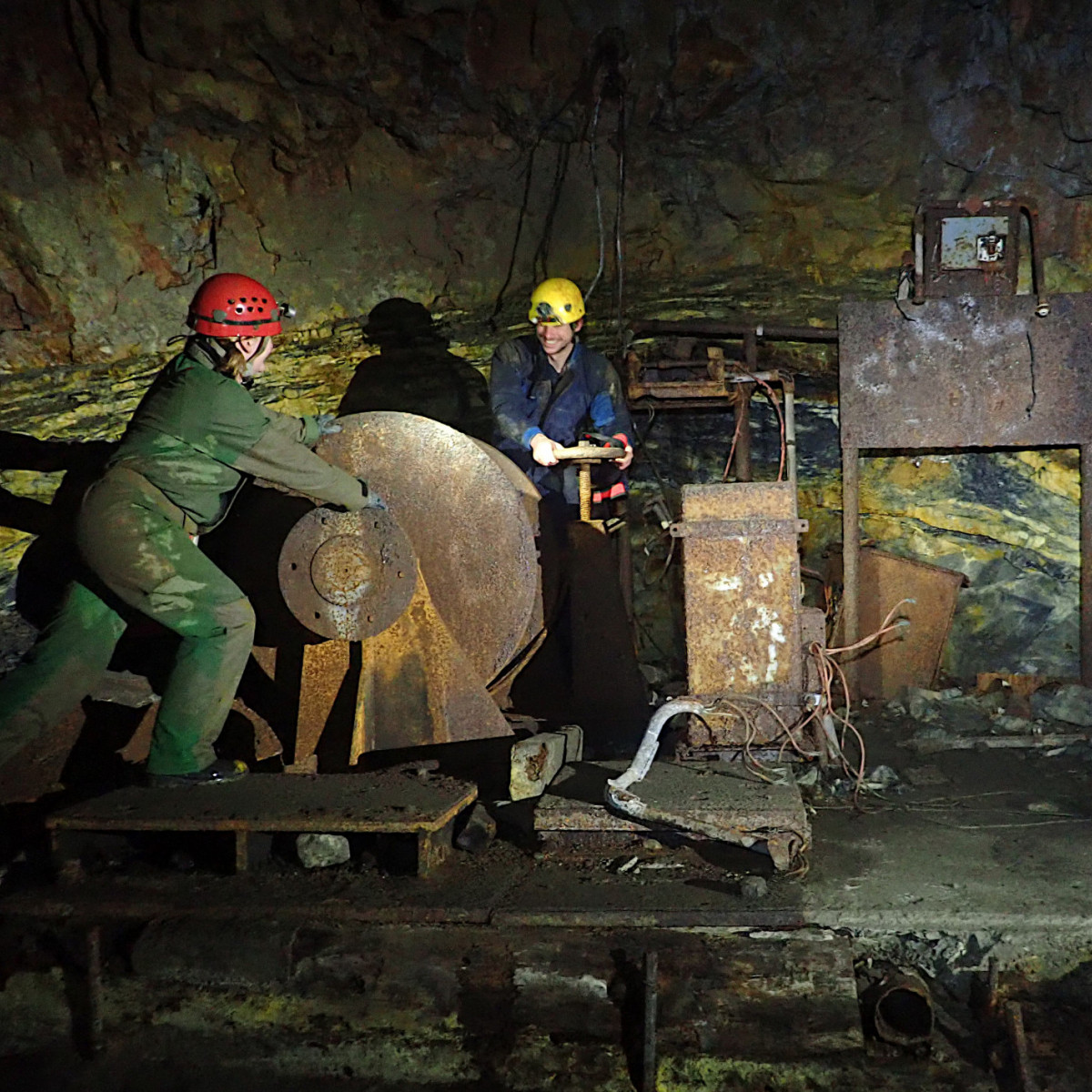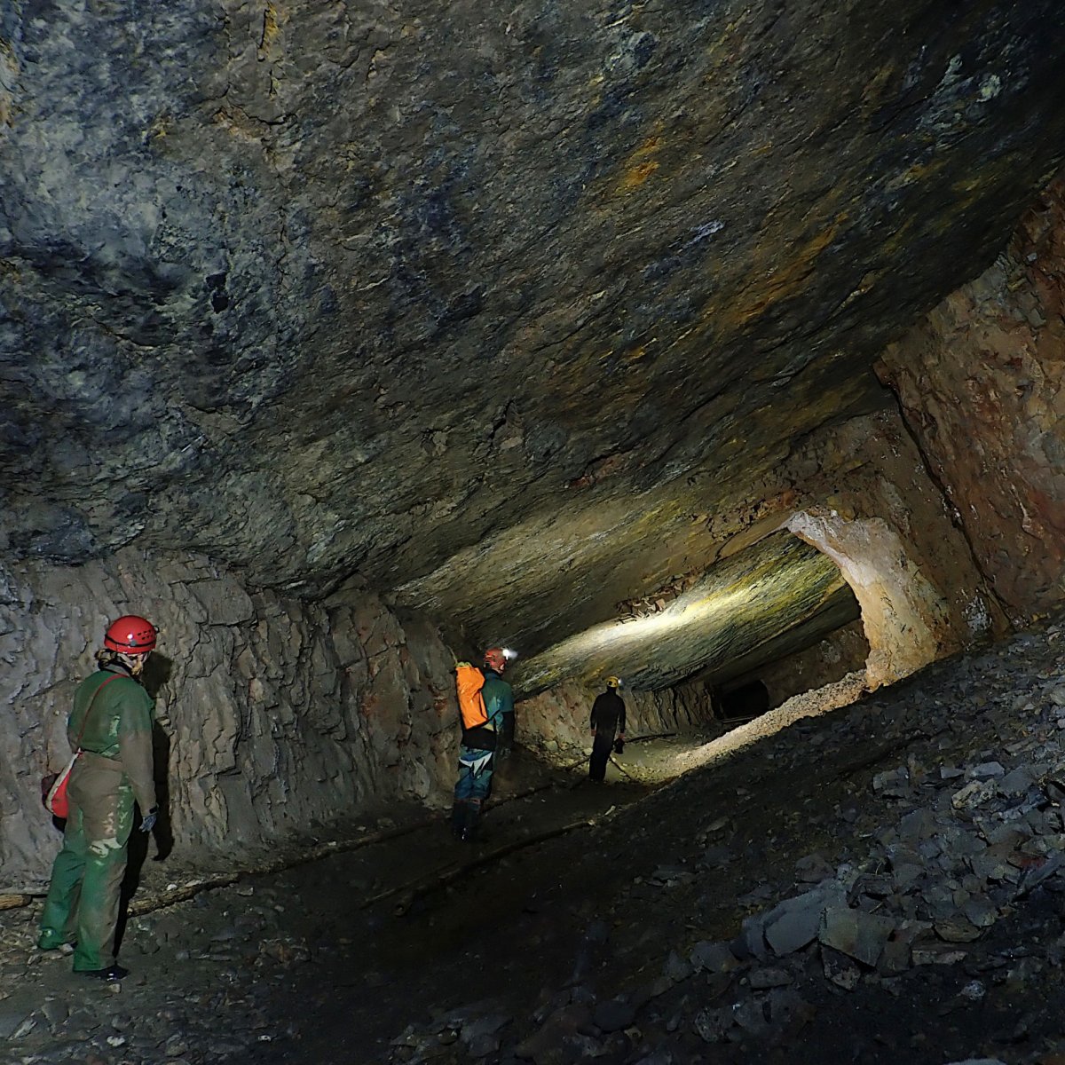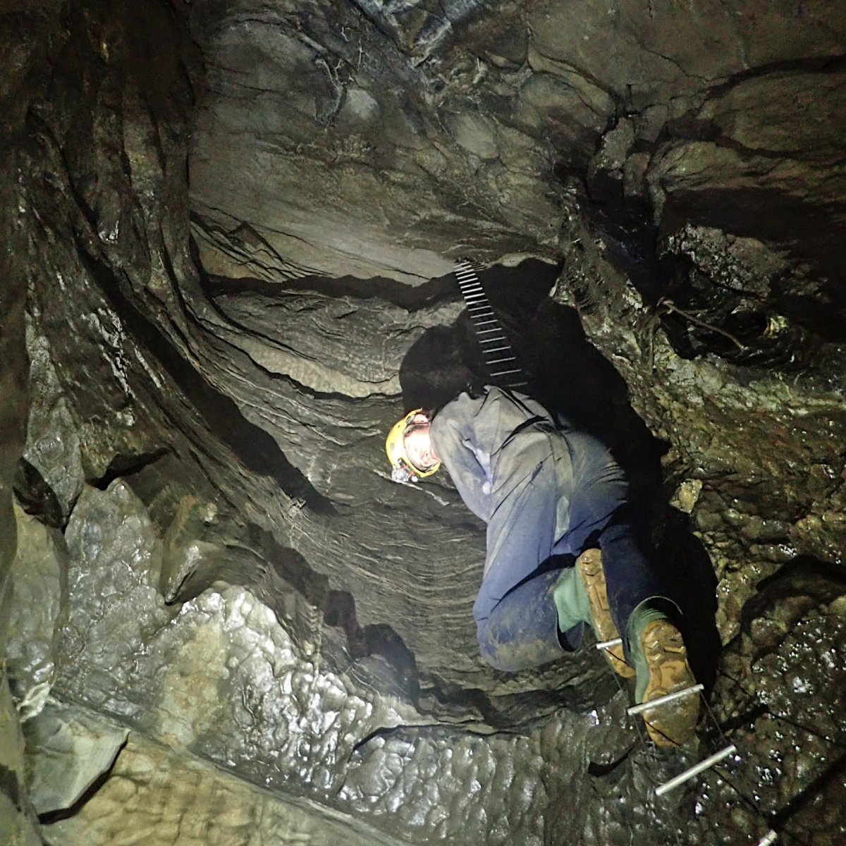 The second trip, dubbed “the big adventure”, comprised exploration of six different caves and mines beginning at the Dinas Silica Mines in the Sychryd Gorge. The most extensive of these was visited first, with the multi-level galleries of unusual colours and angles of Upper Dinas Mine all explored, revealing some interesting relics and artefacts along the way. Then it was on to the smaller, but also interesting Middle Dinas Mine, before continuing to the next port of call at Will’s Hole. Due to recent heavy rain the normally easy scramble to the cave was now engulfed in a foaming waterfall, so a traverse rope was rigged to protect the crossing to the entrance. The pitch inside was rigged with two ladders, which the team descended to find the cave below entirely flooded with no further progress possible. The last destination for the day was three caves alongside the new Heads of the Valleys road, Vaynor Road East, Vaynor Road West and Vaynor Road Pot Cave. The first of these was quite extensive and all were very different to other caves of the area.