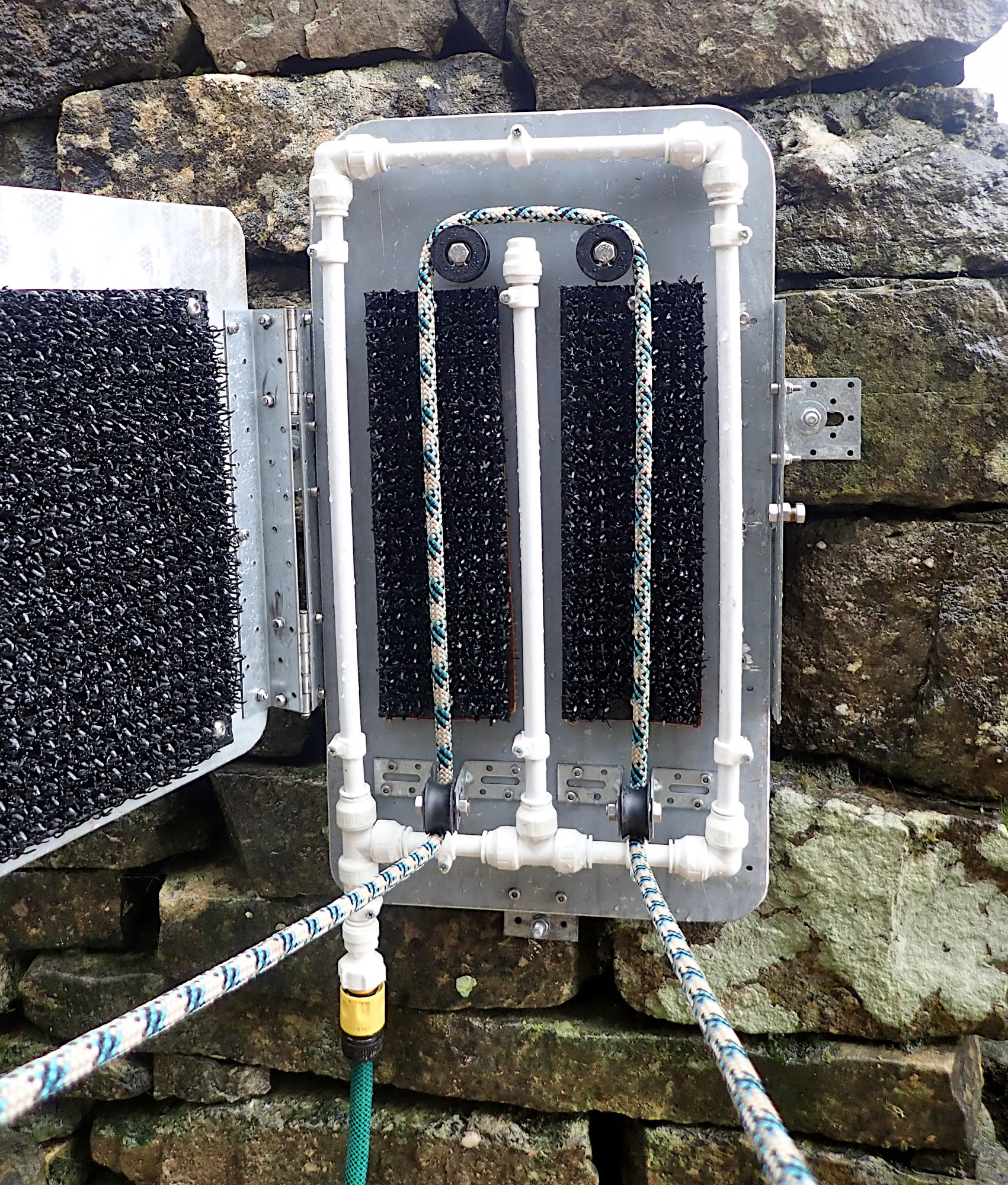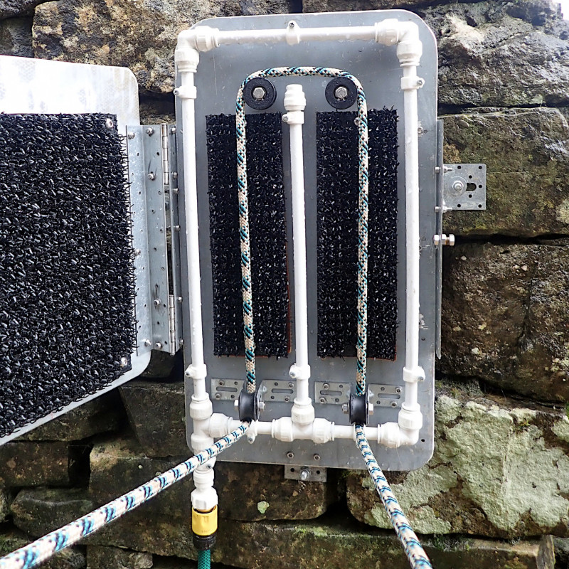 Installed in the outside cleaning area at Whitewalls, the “Scrubbarope” is mounted on the garden wall next to the cleaning sink. To operate simply connect the garden hose to the bottom, thread the rope through the pulleys and close the door. Then turn on the water and pull through as many times as necessary to remove dirt. Unlike most other rope cleaners the CSS Scrubbarope can easily be used by one person due to the angle of the pulleys at the bottom.