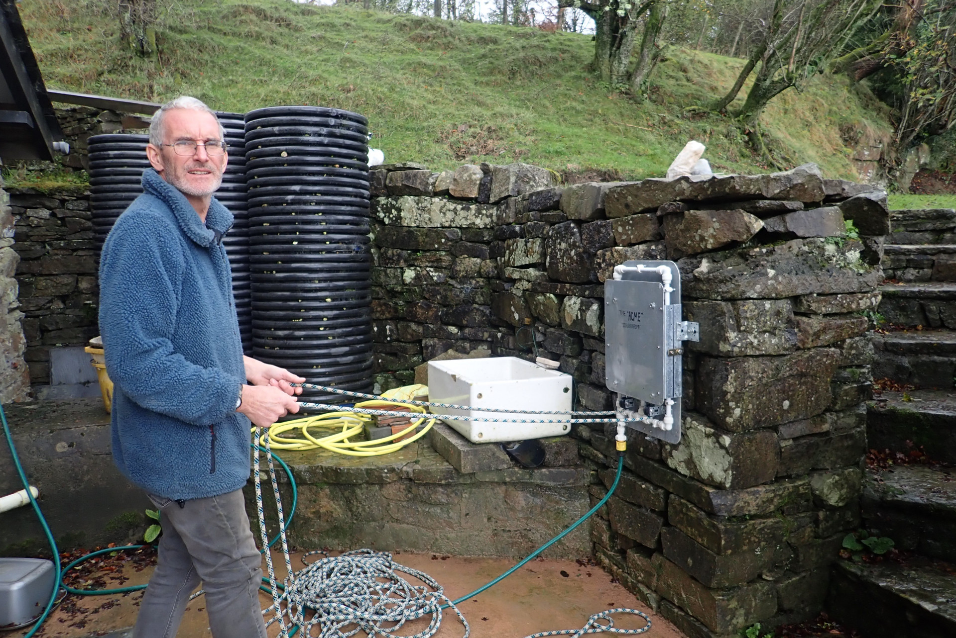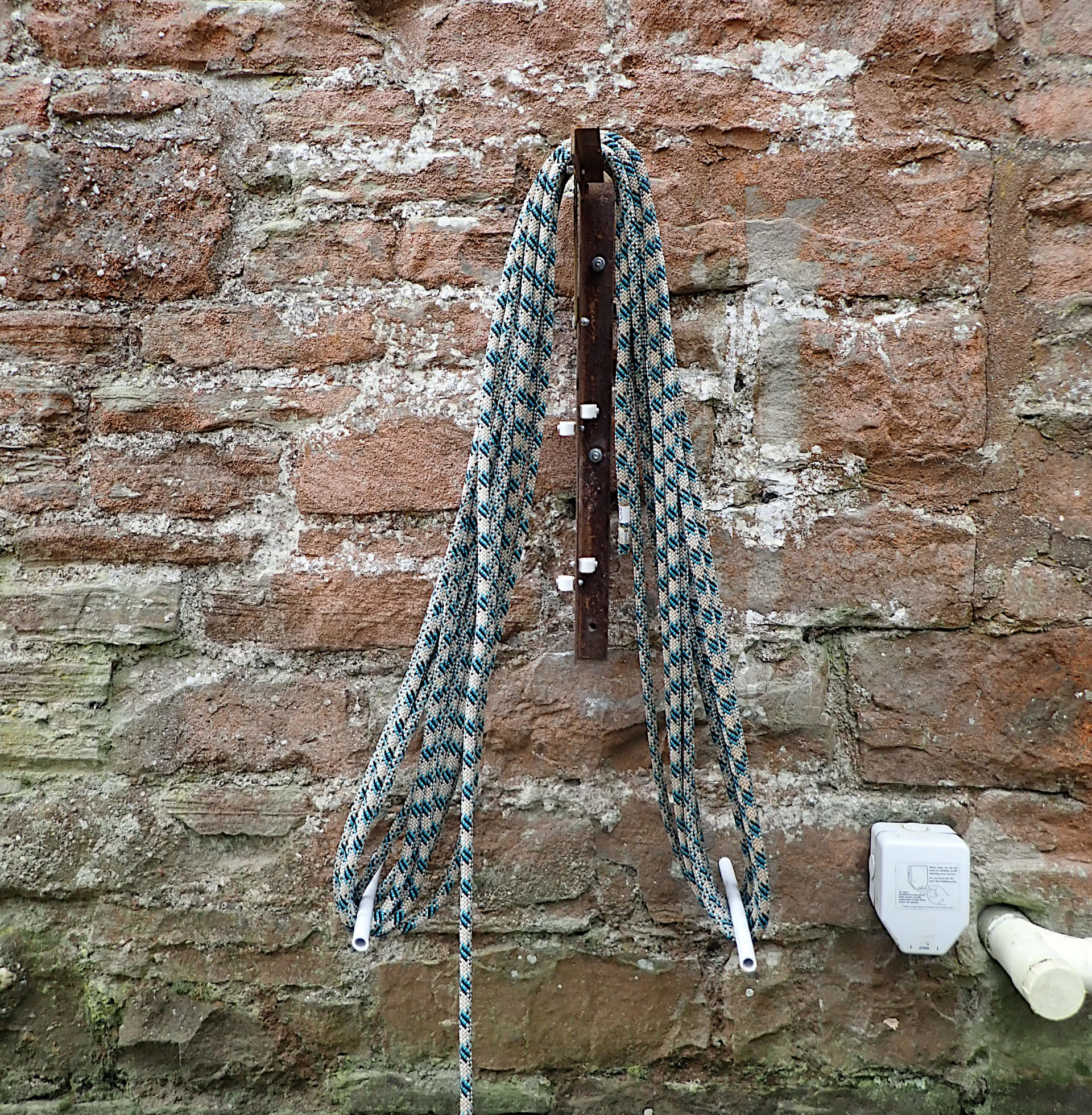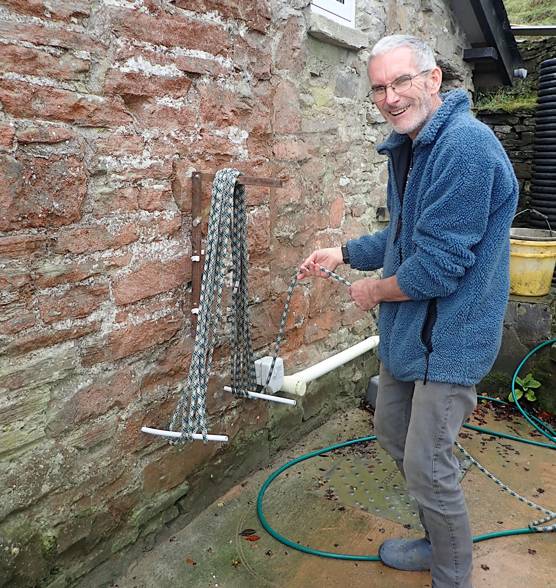 Once your rope is clean, it’s then time to move on to the “Ropeaway“. This is a wall mounted frame for easy rope coiling, located on the wall opposite and stored folded. To use, simply lift and secure the top bar then un-clip the two plastic pipes and place into the holes drilled in the wall below. Then wind the rope as shown in the photo below, coil and tie the loose end below the top bar, remove from the frame and hey presto you’ve got a clean and tidy rope.