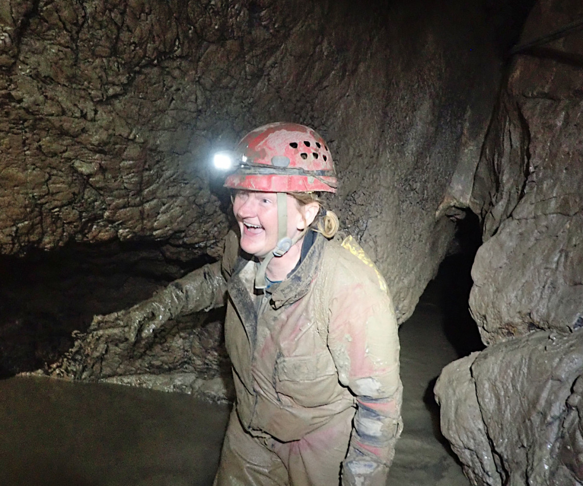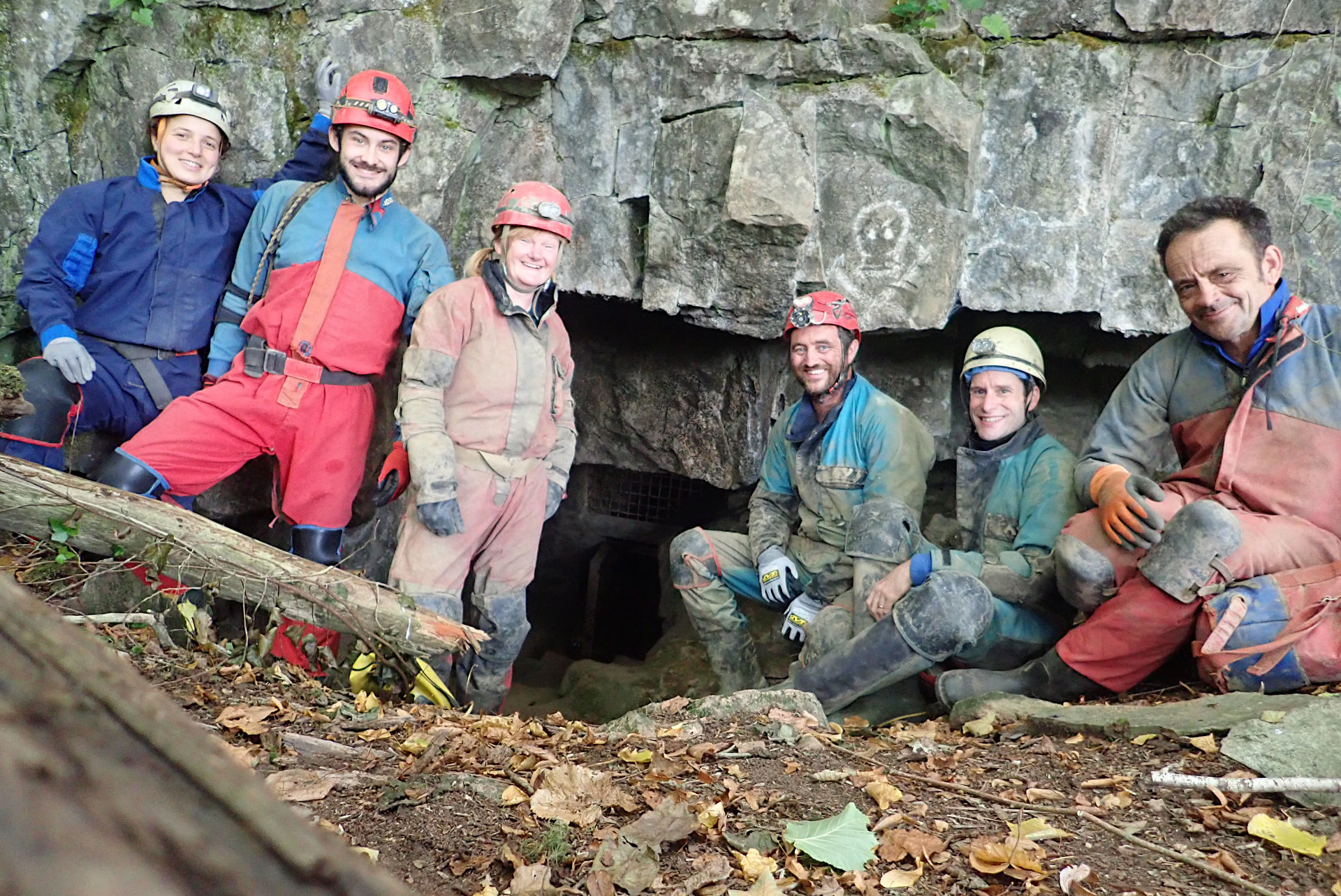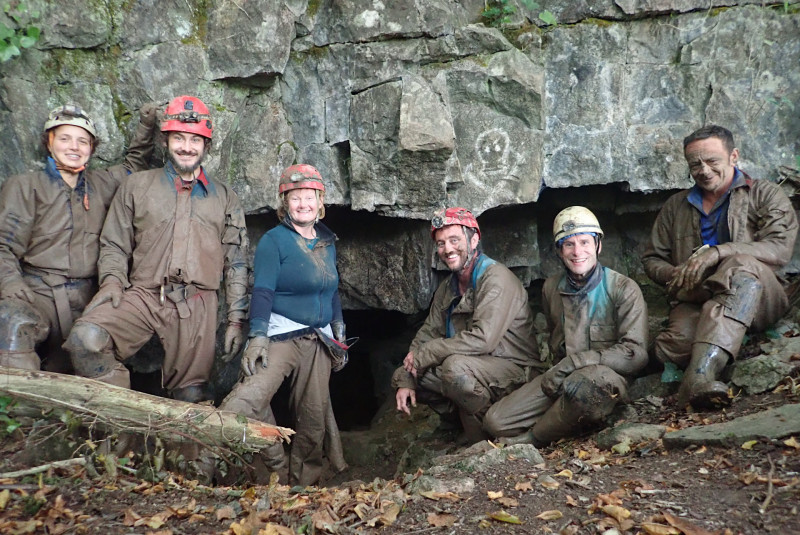 With favourable tide times for a leisurely start time, the team met at the car park in the Forest of Dean at 10am on a sunny Saturday. After a pleasant woodland walk to the cave entrance and posing for the “before” photo, the team then said goodbye to clean oversuits to wriggle through the collection of muddy crawls that lead to the infamous tidal sump. Due to a particularly high tide it took a fair while for the ongoing passage to emerge from beneath the water, then it was time for a thorough soaking in the sump pool to reach the cave beyond. Much fun was had on the muddy climbs, squeezes and traverses that followed, after which pristine formations started to come into view as the Hall of Thirty was approached. This is regarded to be the best decorated chamber in the UK, with a floor full of stalagmites on a grand scale and many other wonders to admire. After continuing a short distance further it was time to return to the muddy passages once more before the tide returned. The team emerged to sunshine and celebrated a successful trip with a drink at the nearby Piercefield Inn.
