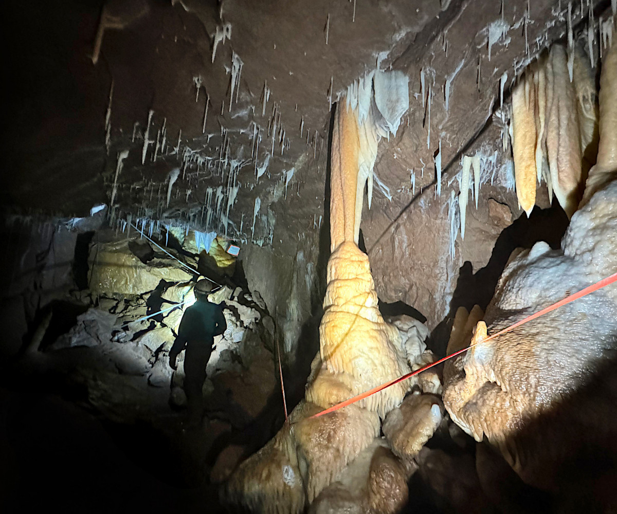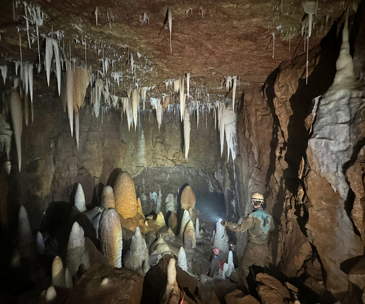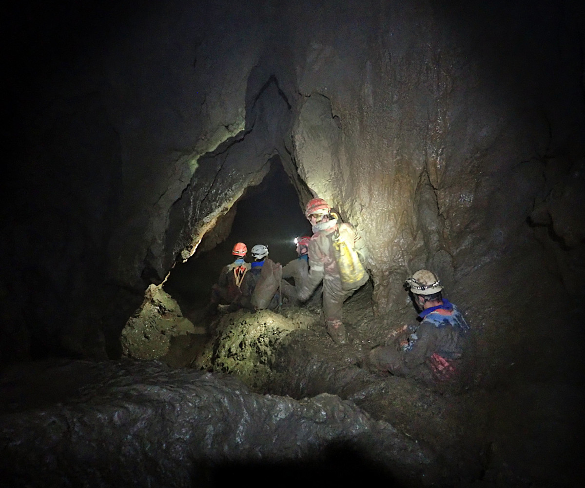With favourable tide times for a leisurely start time, the team met at the car park in the Forest of Dean at 10am on a sunny Saturday. After a pleasant woodland walk to the cave entrance and posing for the “before” photo, the team then said goodbye to clean oversuits to wriggle through the collection of muddy crawls that lead to the infamous tidal sump. Due to a particularly high tide it took a fair while for the ongoing passage to emerge from beneath the water, then it was time for a thorough soaking in the sump pool to reach the cave beyond. Much fun was had on the muddy climbs, squeezes and traverses that followed, after which pristine formations started to come into view as the Hall of Thirty was approached. This is regarded to be the best decorated chamber in the UK, with a floor full of stalagmites on a grand scale and many other wonders to admire. After continuing a short distance further it was time to return to the muddy passages once more before the tide returned. The team emerged to sunshine and celebrated a successful trip with a drink at the nearby Piercefield Inn.