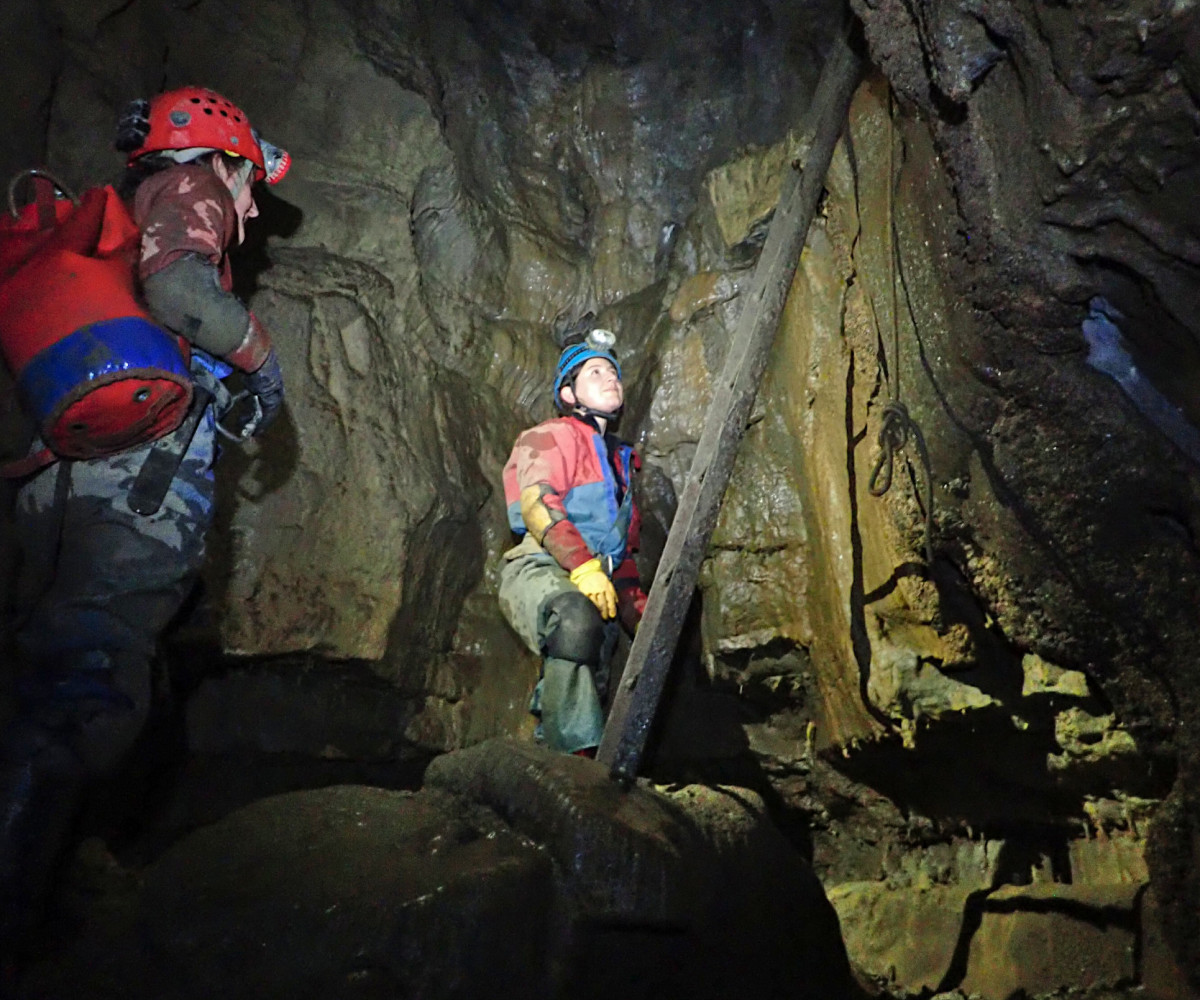 A team of early arrivals headed into the uniquely muddy but interesting cave of Ogof Cynnes in the wild moorlands of Llangynidr on Friday. Ladders and scaffold bars were delivered to the cave and installed as new fixed aids, and old ropes and digging detritus found on the caving trip beyond were taken out.