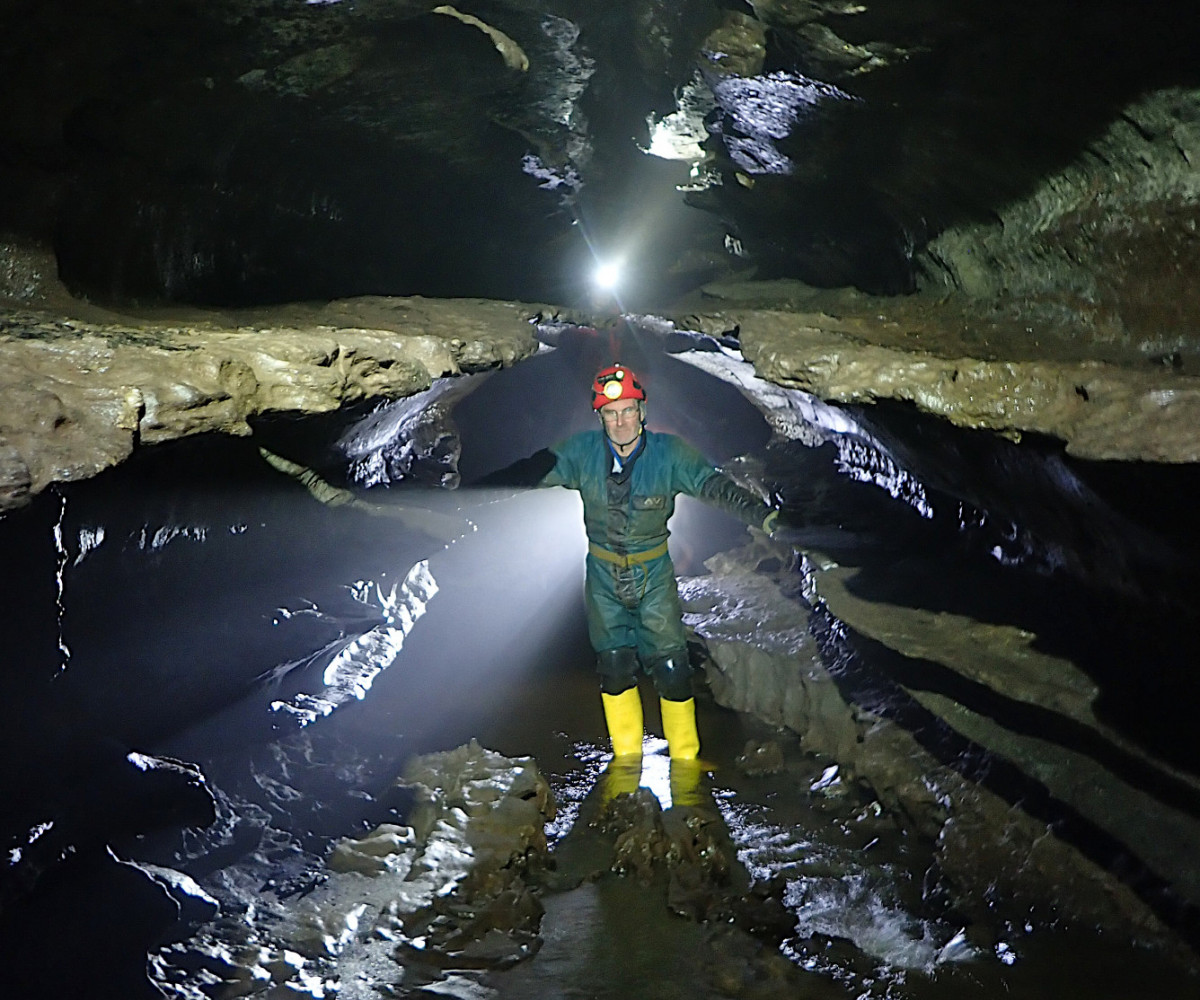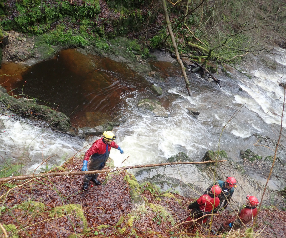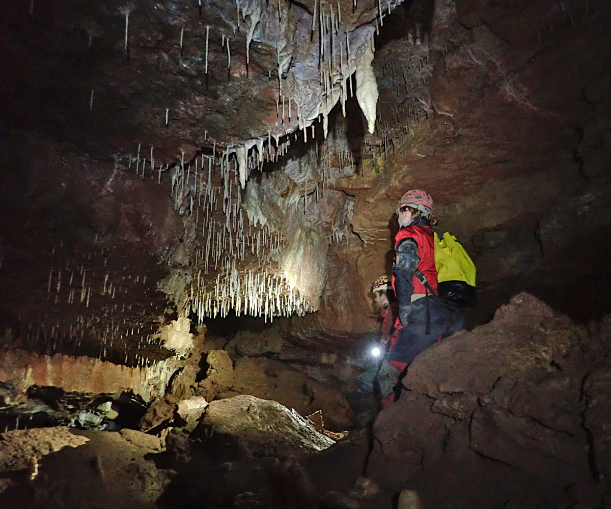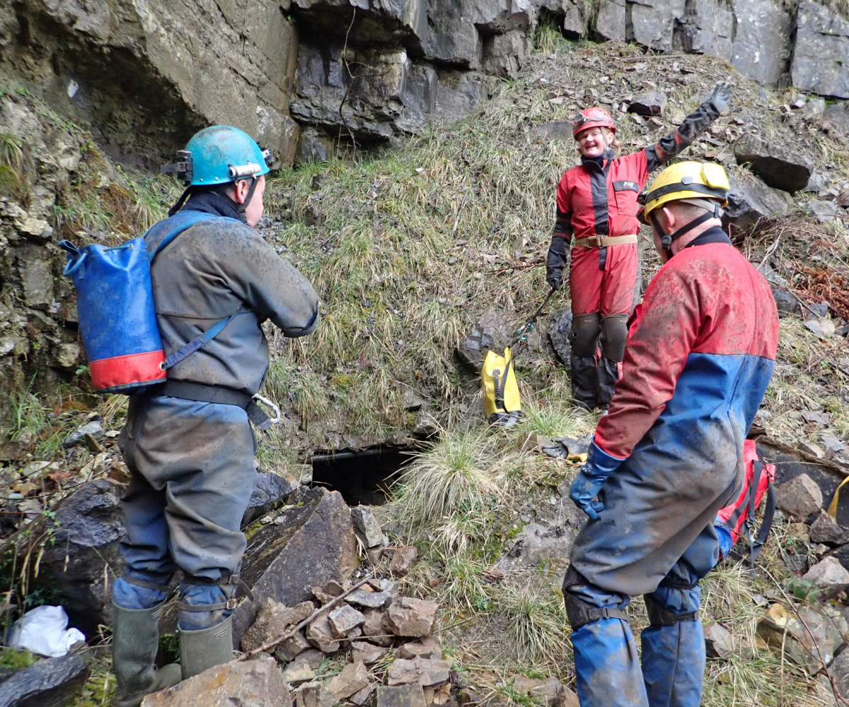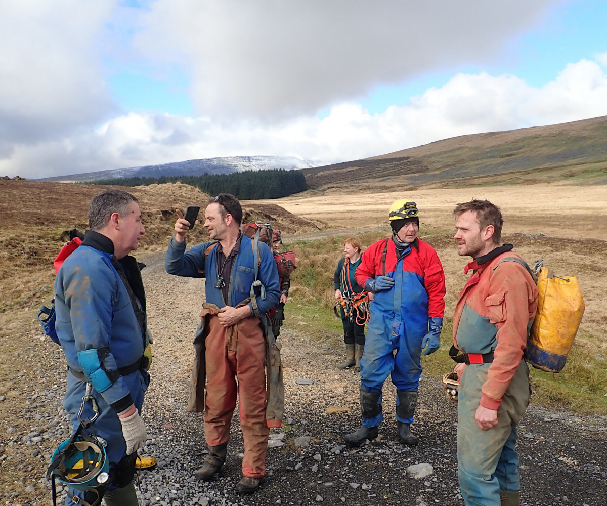 The caving started early for some with a trip to Dinas Silica Mines on Friday afternoon where one of the team also did some cave diving. After the recent heavy rain, the main Saturday trip was changed from Dan yr Ogof to Pant Mawr Pot. This was a well-attended trip and the sun was even shining on the long walk over to the cave entrance. The shaft was descended using SRT, to land in the impressively large passage below. The streamway was followed to the sump, visiting the high-level well-decorated sections along the way. Other trips also took place on the Saturday, with three new members surveying and digging in the environs of Priory Road in Agen Allwedd, a digging trip in Pwll Estrys, and a short Daren trip to Big Chamber Nowhere Near the Entrance.