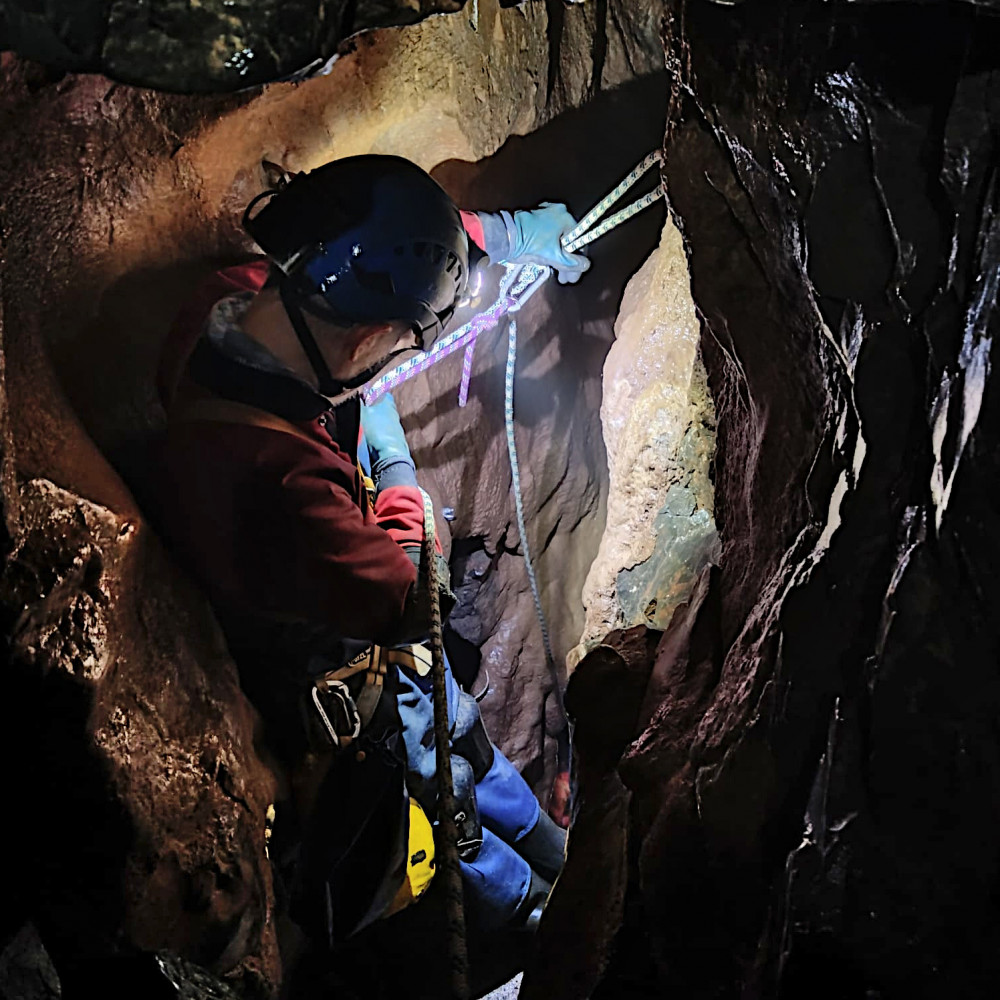 Saturday’s main caving trip was to Tunnel Cave in the Black Mountain area. After a bit of a trek to the cave, the entrance pitch was rigged for SRT and the team abseiled in to begin the journey towards Cathedral Cave in the Dan yr Ogof complex. This was reached via a collection of traverses and roof tubes, passing some interesting formations along the way. A view down into Davy Price’s Hall in Cathedral Cave was had at the end, before returning by the same route to prussik back up to the surface.