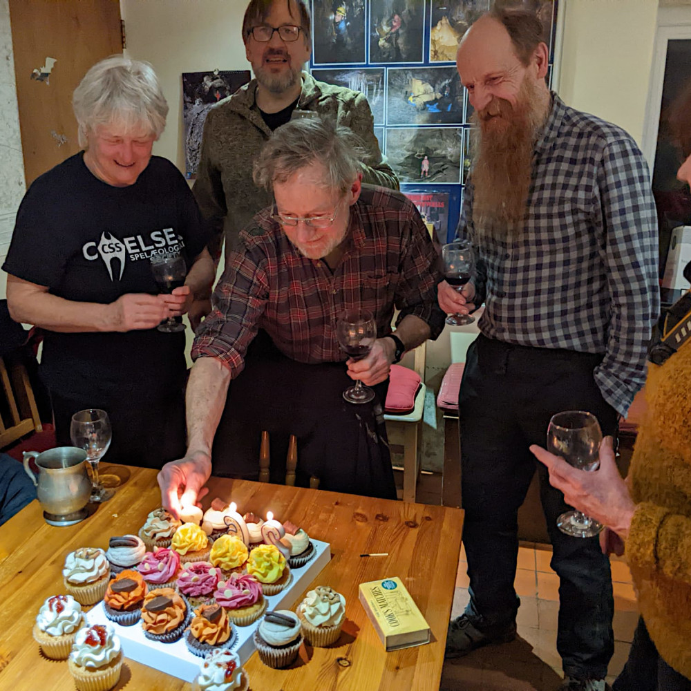Back at Whitewalls in the evening the joint 263rd birthday of Mel, John, Stuart and Chris was celebrated, starting with a red wine tasting session. This was followed by a choice of dinners and desserts, birthday cakes and a barrel of beer, and a good time was had by all. On Sunday a group of members made a caving trip to Ogof Draenen, which was sportingly wet in the entrance series, visiting Gilwern Passage and sections of the Waterfall Series.