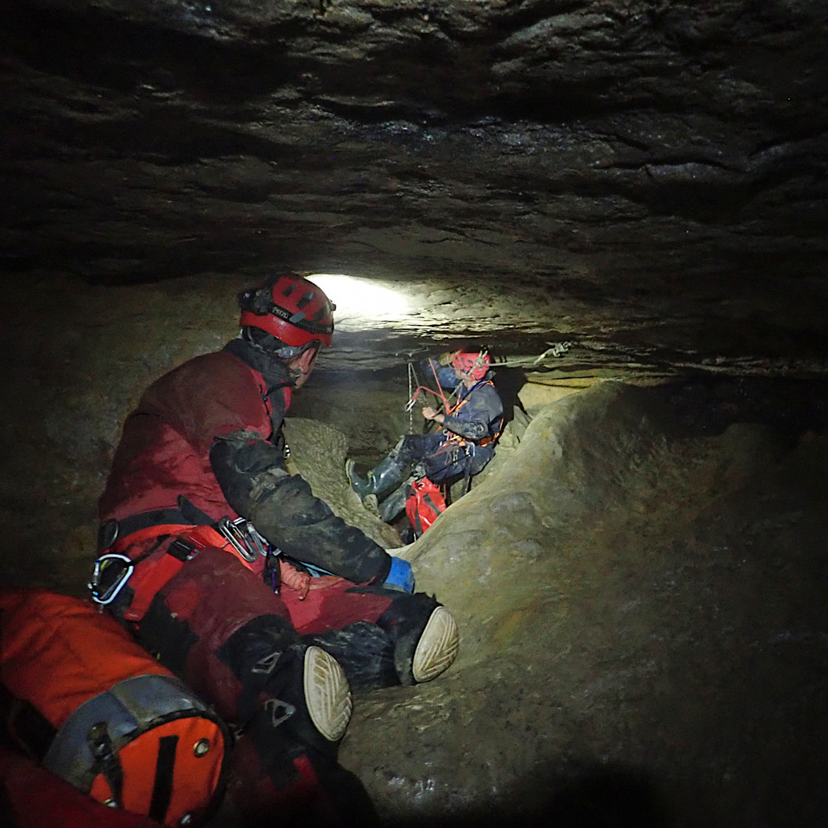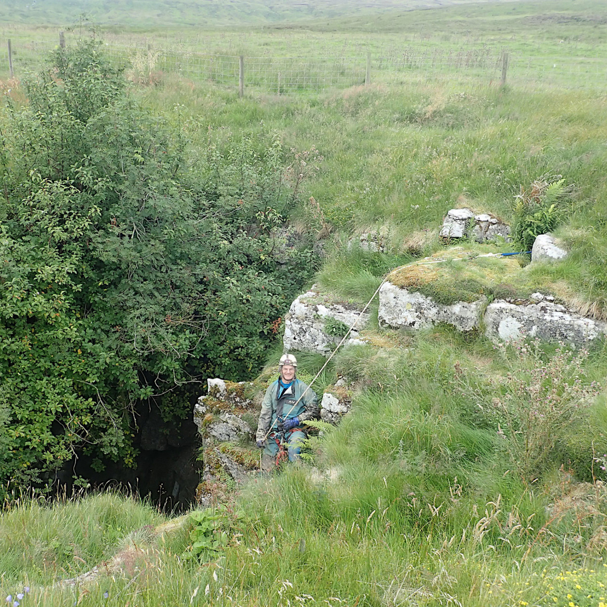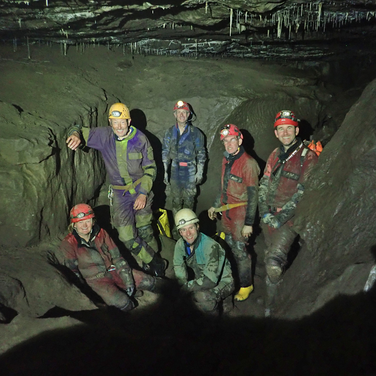Wednesday’s caving trip was to the relatively new discovery of Mayday Hole in Dowlass Moss. This multi-pitch SRT trip offered a very different trip to that undertaken the day before with a medley of short pitches and some interesting squeezes to negotiate along the way. With the team reinforced by additional members, Thursday saw another exchange trip, this time in the mighty Easegill system. Team “Cowboys” entered via Cow Pot, where the daylight shaft leads to an interesting route with some rather exciting rigging to the impressive final Fall Pot pitch into the master cave. Meanwhile team “Top Cats” braved the horseflies and extreme sun on the way up to the Top Sink entrance, then followed the narrow meandering stream passage of the upper reaches of the system, tackling two short pitches and a number of traverses, to reach the main cave system beyond. Both teams then traversed the large, impressive and very muddy high-level passage over the Main Drain in opposite directions to meet in the middle, then exit by the other entrance, passing The Minarets and the Painter’s Palette along the way.